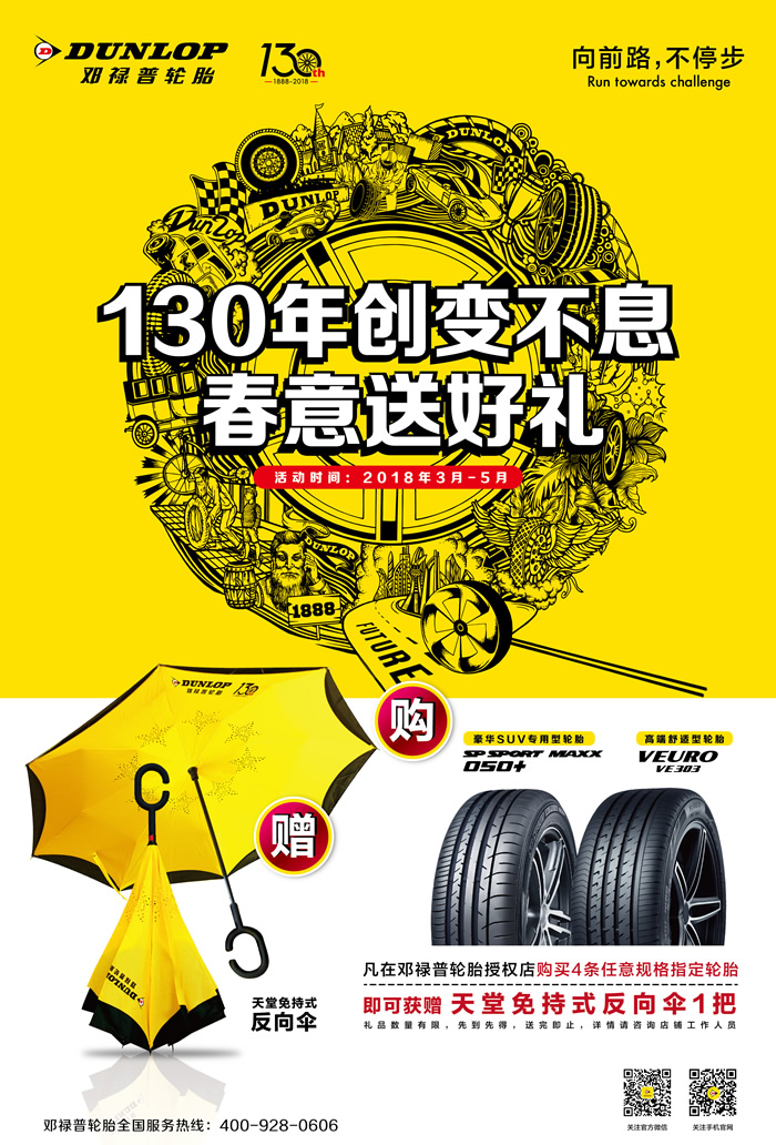 值此130周年慶典之際,為了回饋廣大車主對鄧祿普的厚愛與支持,鄧祿普將在全國范圍內(nèi)推出“春意送好禮”促銷活動:2018年3月至5月,消費者前往鄧祿普指定門店購買4條SP SPORT MAXX 050+或VEURO VE303輪胎,即可獲贈印有紀念LOGO的定制版天堂免持式反向傘,無論風雨,鄧祿普都將與車主一路相伴。